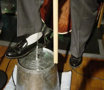 ↑歌姫1号登場! バケツベースの足元はこんな感じ↑ 床の傷防止と音質向上のためお座布を当ててます
