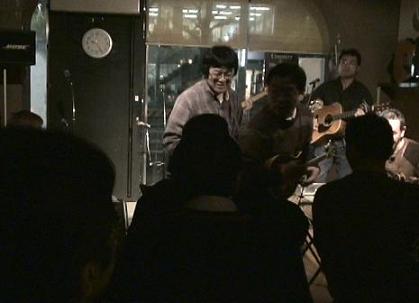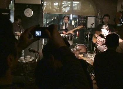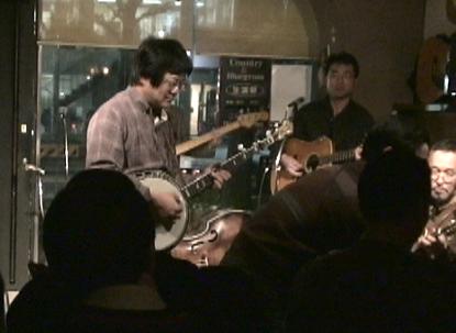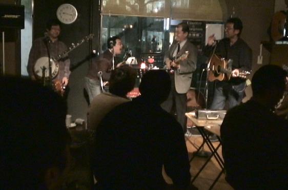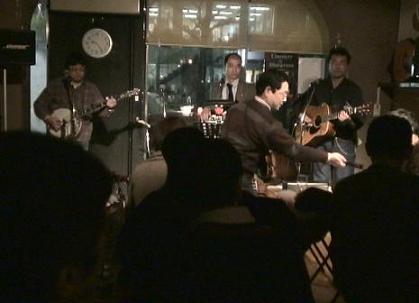 いえね、アレとブルーグラスは見るもんじゃなくてするもんだろ、ってぇ思うんですよ。ですからね、客席で楽器抱えたまんま見てる人にもその場で遊んでもらっちゃおうってわけですよ。んで何しでかしたかってぇと、ラストの曲んとき岸がマイク持って客席になだれ込みましてね、順繰りにソロをお願いしちゃうってお遊びをやらかしたんですよ。マイクを落として壊さないようにってママさんがテープで止めてたのをはがして使ったんでちょいとおこられちゃいましたがね。