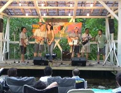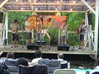 実はセーラ、ブルーグラス好きじゃなかったんです。でも愛する彼のために好きになったんだって!うちのカミさんに聞かせてやりたい・・・。そこで齋藤ひらめきました。「4人揃うのは明日だし、今日はいっそこの二人とステージってのは・・・」って。ジョナサンは勿論OKなのにセーラは「ハズカシー、ムリ!」ときた。未来の夫も「カノジョムリデス」とかばう始末。でもそこはホレ、フェス会場なんて宴会場と変わりゃしない。1パイ飲ませて「教室の生徒より客少ないよ」なんて吹き込んじゃえば↓ご覧のとおり!ステージ後はセーラもすっかりその気になって来年の千葉フェスエントリーが決まりました。そうそう、ベースは千葉フェスに続きグループ・フロンティアの小浜会長にお手伝いして頂きました。