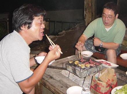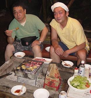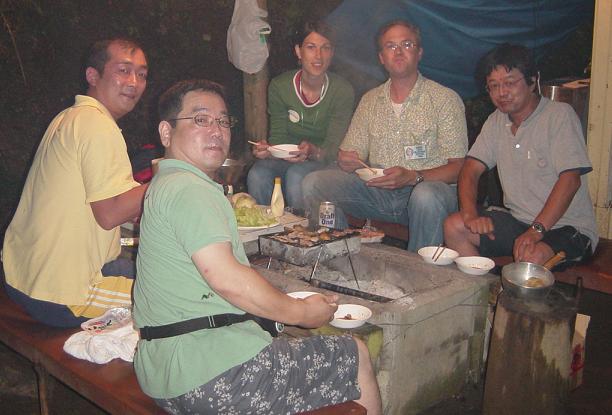 今年の初日は齋藤1人なもんすから、昼間はよそのバンガローやテントをうろついて1パイやったり昼寝したり。晩飯の支度までのんびり過ごします。そして待ちに待ったメンバーの到着と同時に酒池焼き肉林!と、そこへさらに嬉しいお客さん登場!去年ここで仲良くなったジョナサンとセーラです。奥の間(?)に泊まってもらうことにして宴会続行です。お二人は千葉の高校で英語の先生をしていて日本語も達者です。前回、日本に来たばかりのセーラは片言でしたが1年でもうペラペラ!英語と日本語のチャンポンで積もる話に花咲かせたりジャムったりと楽しく夜は更けてゆきます。そうそう、お二人来年結婚するそうです。Congratulations!