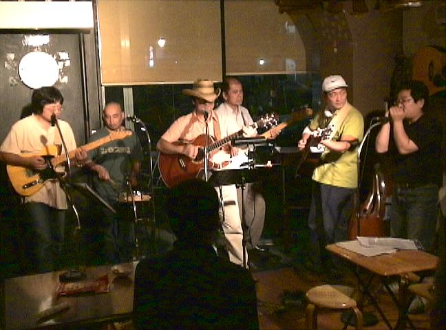 で、こちちらは2ステージめ。場違いなんて物ともせず今度はスタンダード・カントリー〜ロカビリーまでやりました。もちろんリード・ヴォーカルは橘くん。聞きなれた曲ばかりでしたから気楽に楽しめました。ちなみに私の隣は(1ステの写真では陰になってます)橘くんの友人でインチキ・ドラムやらされてます。彼はドラムなんて未経験で・・・そりゃもう・・・見てて気の毒で・・・。パンク・ロックでもやってんのかと思いきや日本のフォークやってるそうです。見た目で判断し・・・ちゃいますよね(笑)!