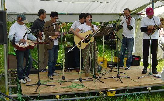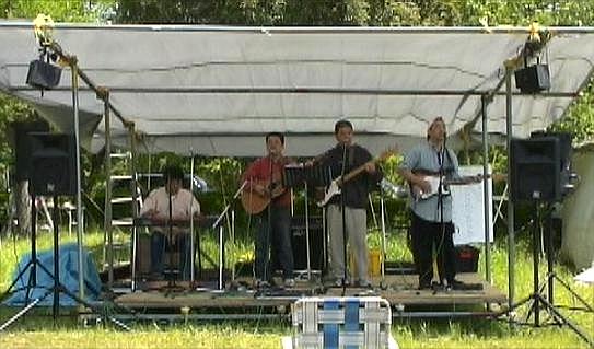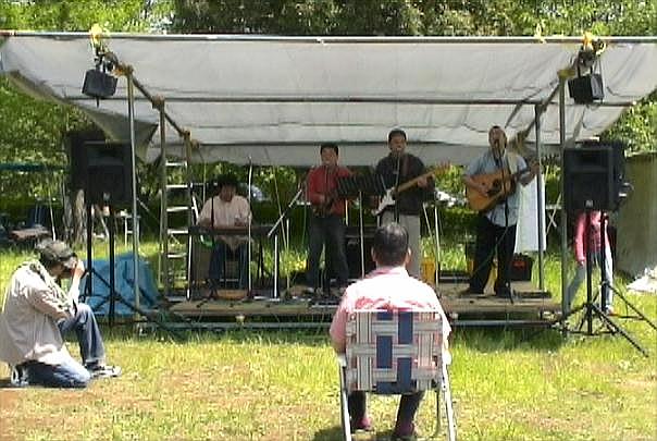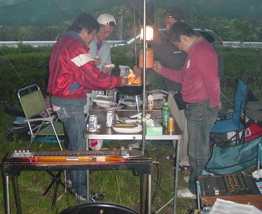 | 明けて4日、キャンプ2日目だというのに皆元気です。ニンニクビタビタのおかげでしょうかね?で、早速平野は他所のバンド(ごめんなさい名前忘れた!)の助っ人でウォームアップ。ジェリーで聴きなれた曲でしたから楽勝? |