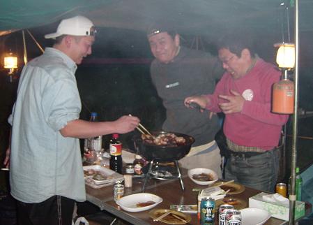 | 岸&山ちゃんの仕込みは野菜少々と牛豚鳥の肉づくし!なんだか子供が喜びそう・・・。これに山ちゃん持参の生ニンニクビタビタで野蛮人の本能に火が付きます。↓ほら春爛漫の誰かさんが興奮してきました!立って食ってるのもコンロの足が長すぎたせいばかりじゃないようです。鱈腹食った齋藤は、周りでジャムってるにもかかわらず、寒さに震えながら一人爆睡してました。夜は冷えたなぁ・・・。 |
