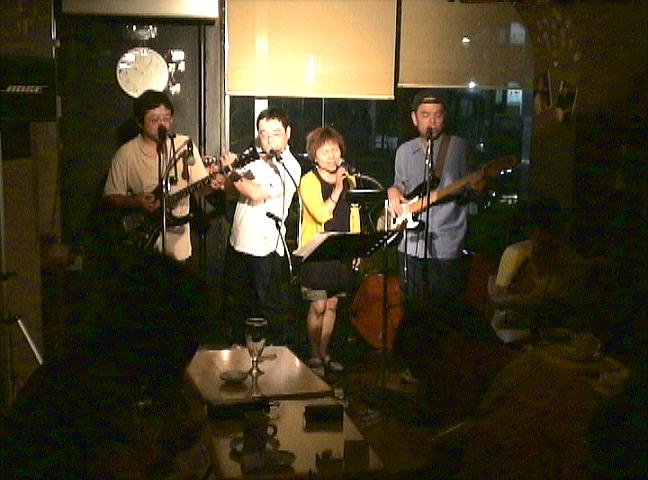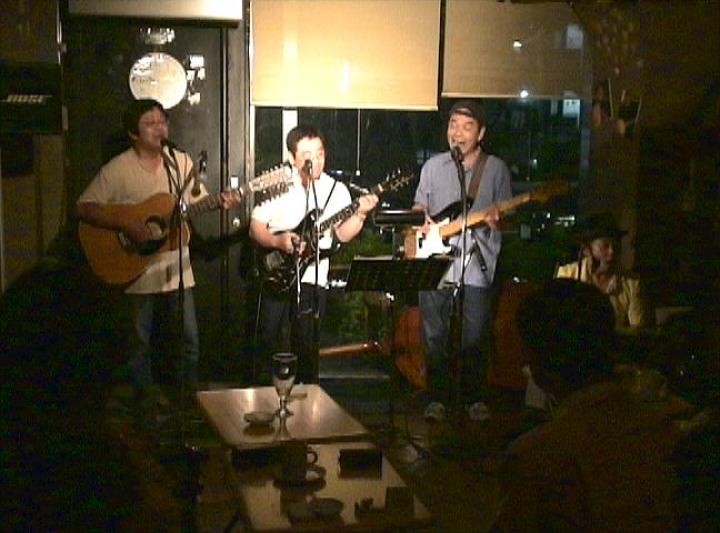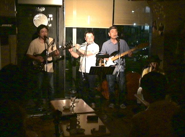 | 夏とくりゃぁビア・ガーデン!なんてのは一昔前の話。でしょうが、イロ物強化月間の名の下、ビア・ガーデン・セット第一弾は今年からレギュラー・メニューに昇格した「グループ・サウンズ特集」であります。もっとも我々はリアル・タイムではあまり聞いてないので復刻版のCDやツタヤの試聴で準備するわけです。只々諸先輩方に喜んで頂きたい一心で・・・。それをブルーグラス聞きに来た人の前で演奏しちゃうんですから我々ってなんてかわいい(ずーずーしい?)後輩なんでしょ!? |