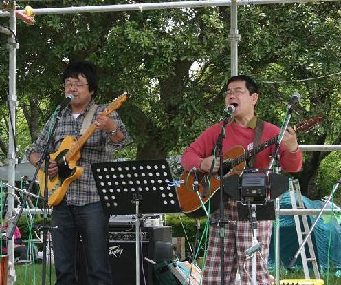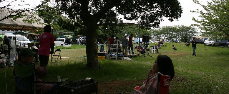 | このキャンプってフリーエントリー制なの知ってました?受付テントの横に大きな模造紙が張ってあって、やりたい人はそこに自由に書き込んで出番を決めるんです。つまり「占領」も夢じゃありません。ま、そんなツワモノはいませんけどね。だから今回は2回出ちゃおかなって企んでたんです。本当は。オープニングと日が暮れた頃にでも"Nitty Gritty"で2部構成で、なんてね。ところが暁子さんが仕事の都合で3日の15時頃には帰る、てことは岸も帰っちゃうわけで・・・。んじゃ1回しか出来ないじゃん!それに周りを見渡せば、いつの間にやらこのキャンプ、完全にブルーグラスのフェスと化してるし・・・。んじゃ皆さんの「箸休め」にでも、って急遽"Eagles"に摩り替えた、というワケ。 |