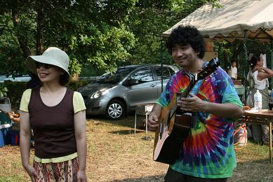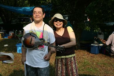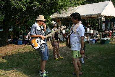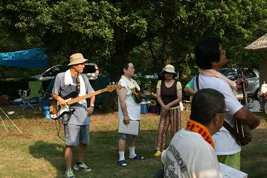 で、その猛暑は既に日々の「しのぎ」で散々味わってましたから今回のさいとーには秘策が。それは「海パン」!いざとなったら水かぶっちゃえ!ってね。これが大正解!散水用のホースで頭からざんぶとかぶれば原っぱの猛暑もなんのその!一人涼しい顔してました。しかし欠点が一つ。そのままだと楽器が濡れてしまいます。そこで窮余の策がコンビニの袋。写真は他所様のお手伝いでステージに上がった時のですが・・・やっぱヘンですよね(笑)。なのでゴーストのときは着替えました。