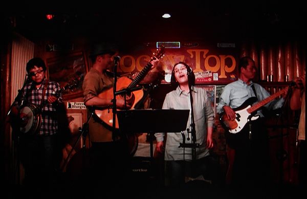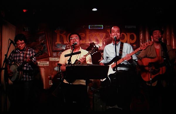 10数年ぶりのロッキートップ!と言っても「出演」ではなくて、あくまで「ゲスト」。つまり、お客さんが歌わしてもらうアレです。"Lonesome Grass Boys"の小浜さんのご好意でした。でもそんなこたぁどーでも良いんです。ロッキーのステージに立てたんですから!いえね、去年山ちゃんが戻った頃から「来年はロッキーに出たいね!」なんて話してたんですよ。でも我々は観客動員力限りなくゼロ!の開始時刻にメンバー揃わないバンド。きっかけさえありません。だれかにおすがりしない限りあそこのステージには生涯立てないんです。そしたら小浜さんに声かけていただけて・・・。いやぁホント嬉しかった!賄いおばさんも歌えたし!