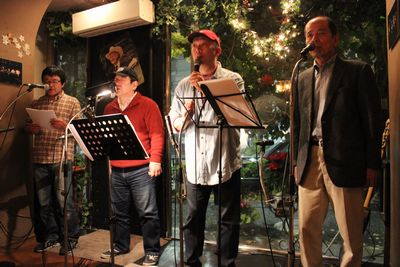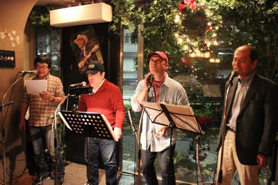 またこの季節がやってきました。1年の締めくくりネタです。これらも以前は別仕立てでやってたんですが、お献立が次々復活してもう入りきりません!と、ウレシイ悩み。でもアカペラも、年に一度ながら繰り返してるとなんとなく形になるようで、つい「欲」が出てきてしまいます。Jag だってあれもこれも、と・・・。それもこれもこの4人が揃ってるからこそ。ま、伸びしろは高が知れてるでしょうけどね(笑)。あ、写真は中麦価さんの撮りまくりぃから厳選(?)して。 |