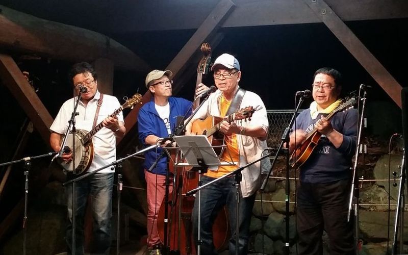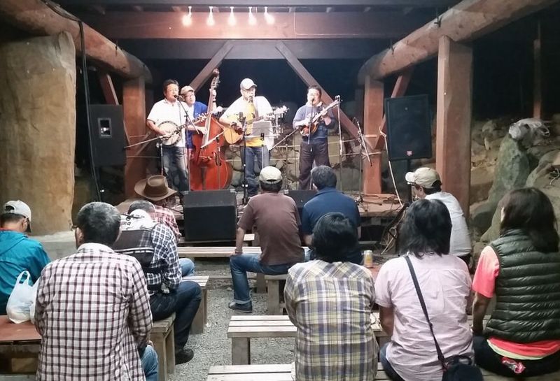 | 以前一度参加して以来、また行きたい!ってずっと思ってたんです。ところが年2回の開催はいつも第2土曜日。だからずっと行けませんでした。が、こんとん館卒業した今、もう行かない理由がない!なのでまだ寒いころから楽しみにしてました。もちろん頭の隅っこに「その日は我息子の披露宴」てぇのはありましたけどね。でも披露宴は17時から!と聞いたところから古い頭の中フル回転して小さな戦いが始まりました。何時までかかるのか?清算とかご祝儀の処理とかどれくらいかかるのか?いや、何より会場からの所要時間は?等々。でも決意しました。何が何でも行く!例え全て終わって皆さん半ば眠りに就いていたとしても!と。そして当日、結婚式〜披露宴をつつがなく終え、車に乗り込んだのが20時半頃。あとはもうひたすら走ってステージ30分くらい前には無事到着!念願果たせました。しかもホーボーズOBのベース弾きに久々出会えて、しかも唐突ながらベースも頼んじゃって。どうです、いっぱしのブルーグラスバンドでしょ!ま、中身は「ごっこ」の域を出ませんけどね(笑)。平野も気に入ってくれたようで、早くも10月も参加が決まりました。ここよかです! |