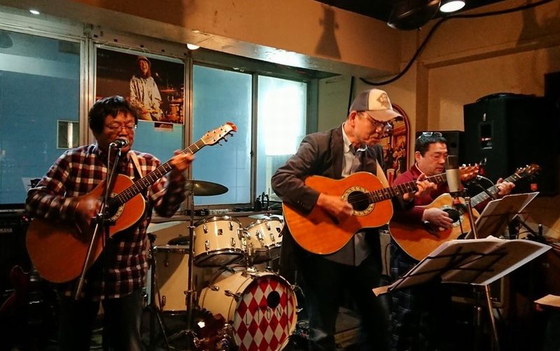 | ずっと懸案だったOVATION3本のみ!のステージです。元々は、平野&さいとーコンビのJOY COUNTRY 用でしたが、他でも使えるように、練習では3人で準備してました。なのでTOPPERS、ちょうど良いタイミングでした。 |