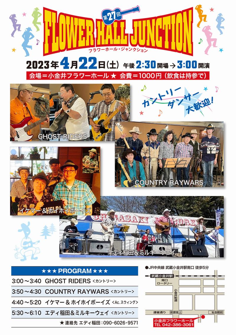 | 2019年8月故小濱さんのバンドでトワイライト カントリーに参加させていただいて以来、主催のエディー稲田さんには「バンド足りなかったらいつでも!」とお願いしていた甲斐あって、以降何度か呼んでいただいてます。今回はエディーさんのもう一つのイベント FLOWER HALL JUNCTION で、こちらはお初です。 |
