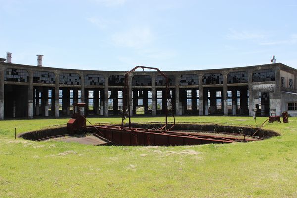なかなか立派な扇形庫です。梅小路以外ではここと津山くらいでしょう。ここは後でゆっくり見ることにして、まずは機関庫ミュージアムとやらを。奥の赤っぽい建物です。予習しちゃったのでおおよその察しは付きますが・・・。![]() ん~、予想通り。イベントでもやらない限り、入場料当分無料でもこれで人集めるのはかなり厳しいです。なのでささっと見て出ようとしたら「どちらからですか?」とスタッフが。それがきっかけで話し込んでしまい、「せっかく遠い千葉からみえたんですから・・・」と、普段は危険なため立ち入り禁止の扇形庫内を案内していただくことになりました。後でゆっくりと言っても、柵の外からでは大した写真は撮れまいと半ばあきらめていましたからね。これはありがたい!じっくり撮らせていただけます。まずは改めて全景から。 |