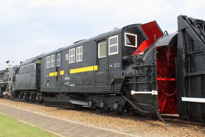 | そして・・・じゃん!名寄北国博物館の「キマロキ」です!こりゃ見事!遠目にもきれいに手入れされてるのが分かります。しかもヘッドライトが点灯しています!これはすばらしい!こりゃ興奮するなというほうが無理な話。シャッター押しまくりです!実際このレポまとめるのに写真選びに苦労しました。あ、「キマロキ」ってぇのは機関車+マックレー+ロータリー+機関車で除雪する編成のことで、それぞれの頭文字を取ってキ・マ・ロ・キね。先頭の機関車に牽かれたマックレーが線路脇の雪をかき集め、ロータリーで遠くへ吹き飛ばします。現役当時でもめったに拝めなかったようです。 |