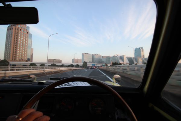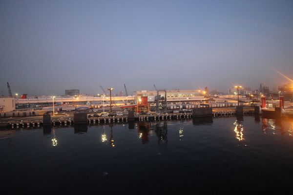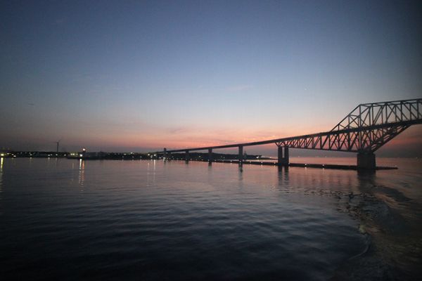 目が覚めたら、船はもう東京湾の奥まで入っていて、ちょうど東京ゲートブリッジをくぐる所でした。朝焼けもきれいです。こりゃ寝ぼけ眼でも写欲がムラっと湧いてきます。あと30分ほどで入港だし。起きますか!