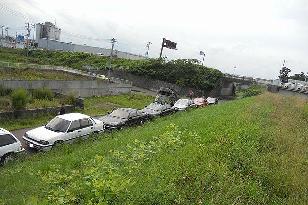 まず向かったのは、マギーさんがあの日津波から逃れるためにバイクでよじ登った場所から。しかし土手沿いの狭い道でにこの台数では停める場所にも苦労します。はみ出しも何台か・・・。