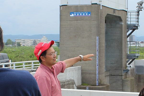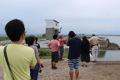 私は今回で4回目になりますが、来るたびに緑が増えている気がします。といって一向に進まぬ復興は変わらないんですが・・・。先日NHKでも報道されてましたが、戻りたい人もいれば移住したい人もいて、これに行政が板ばさみになって思うに任せないようです。戻りたい人が少ないと、費用対効果も微妙で、国からの復興予算も下りにくいとか。まだまだ時間がかかりそうです。名取川河口近くの水門は今回初めて来ましたが、柱には「津波到達高」と書かれた青いプレートが・・・。これでは一溜まりもなかったでしょう。