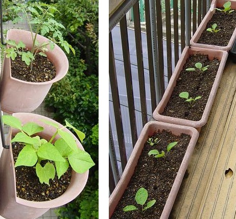 万能ねぎ 夏に向けて麺類での活躍が期待されます 蒔いた覚えのないミニトマトと間引いたはずの蔓無インゲン(左)に本植えの済んだナス(右) |