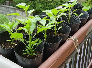 蒔いた覚えのない○○ピーマン 冬の間せっせと生ゴミなんかも埋めて土を作っておくんです。どうやらその中に調理したピーマン(たぶんバナナピーマン)の種も入ってたようです。気温が上がってきたらそこいらじゅうから芽が出てきました。その一部をストックしたんですがナス優先なのでまだ本植してません。なにせスペースが限られてるもんですから。 |
