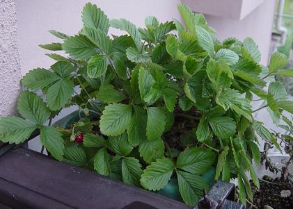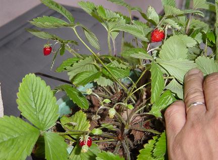 こちらも3年目の○○いちご(名前忘れた) 3年前の春「夏でも実が生る・・・」につられて2袋蒔いた唯一の生き残りです。1袋目は芽が出たところで低温と雨に打たれて全滅。ここでムキになったか2袋目を蒔いたんですが、またしても低温と雨であわや全滅!急遽私の部屋へ持ち込み裸電球を当て続けました。その甲斐あってか空しくか2本だけ生き残ったんですが、苦労した割には大して実も付けずお荷物状態になっていました。それも去年1株枯れてもはやこれまでと諦めていたところ、1株になった途端急に元気が良くなってこの春からポツポツ実をつけてます。大きさも以前より大きくなって、畑見回りのお駄賃ぐらいにはなります。味も良いです! |