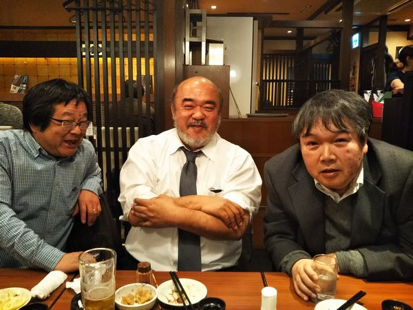こちら市川のぷ~さん二人に挟まれた市川の働くおじさん。あ、お店は染谷君のチョイスで「ミライザカ市川北口駅前店」でした。トイレが奇麗だとか。